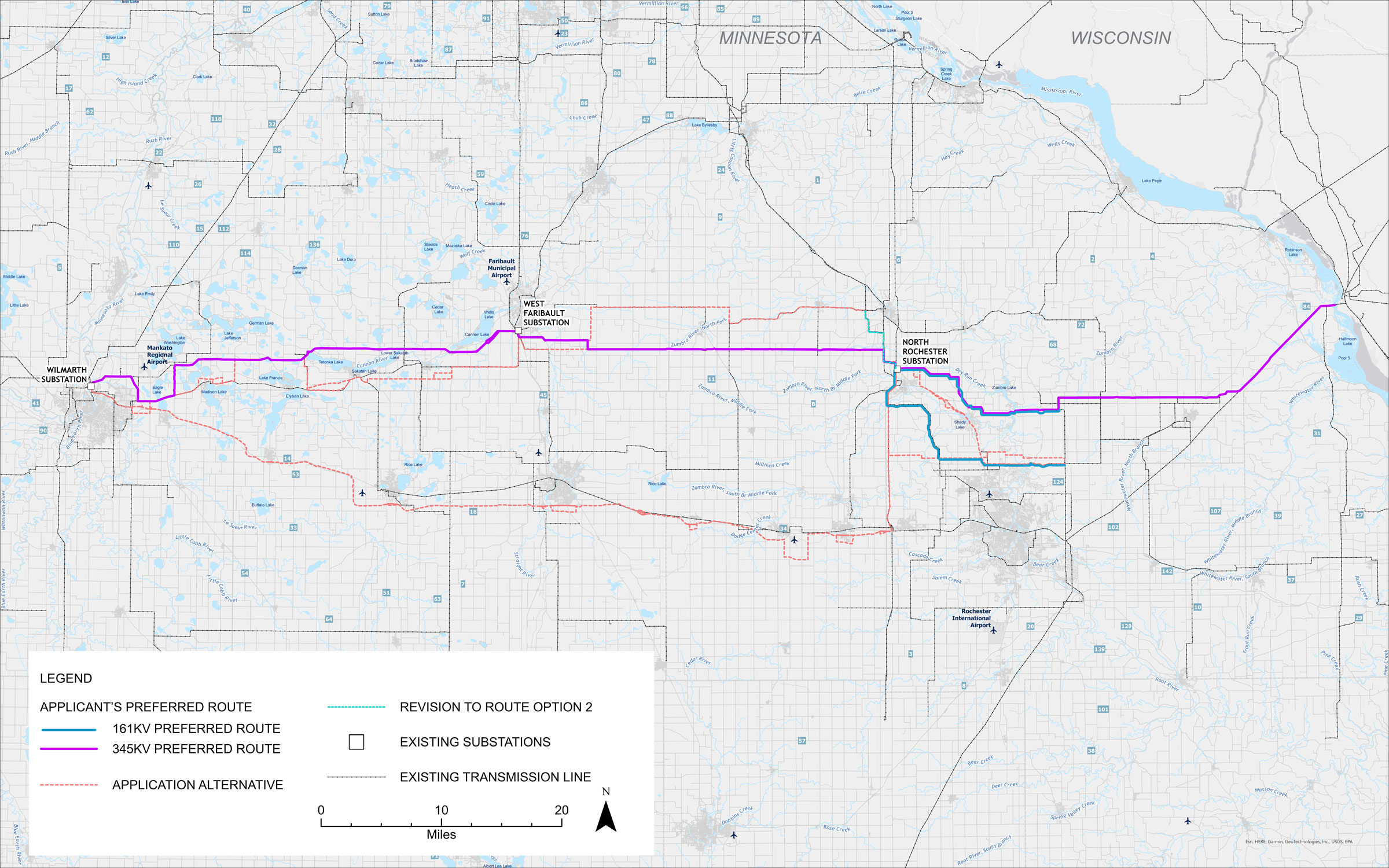 The Mankato-Mississippi River Transmission Project includes about 120 miles of new and upgraded 345 kilovolt (kV) transmission lines between the existing Wilmarth Substation near Mankato and a connection point at the Mississippi River near Kellogg. It also includes building about 20 miles of new 161 kV transmission lines between the existing North Rochester Substation near Pine Island and an existing transmission line northeast of Rochester, which is being relocated from its existing alignment to install the new 345 kV infrastructure. The project includes segments that include either new or upgraded infrastructure.